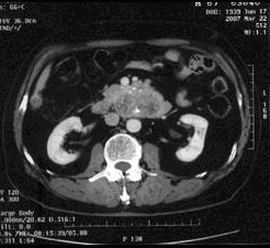 病例1 男,68歲,2006年12月14日,CT掃描發(fā)現(xiàn)胰頭占位性病變,6.0×4.7cm2,腹膜后淋巴結(jié)轉(zhuǎn)移,伴肝內(nèi)多發(fā)轉(zhuǎn)移灶。艾恒+希羅達(dá)化療3療程無效(圖1)。2007年4月5日,開始接受今又生治療,胰腺腫瘤內(nèi)注射今又生1×…今又生治療病例---胃腸腫瘤