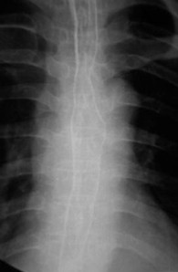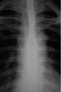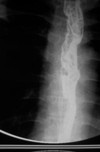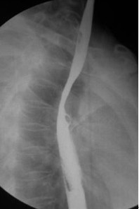 女,51歲,以“進(jìn)行性吞咽困難1年”為主訴于2007年2月19日入院。鋇餐造影、胃鏡示食管上段占位性病變,確診為食道鱗癌(圖1),拒絕手術(shù),行放療+今又生治療。食道鏡下瘤內(nèi)注射今又生,1×1012VP/次/周×6,放療在今又生注射3 d后開始,采用常規(guī)分割三野等中心照射,劑量65cGY。治療結(jié)束后4周,食管X線、胸部CT顯示腫瘤完全消退(圖4-5)。