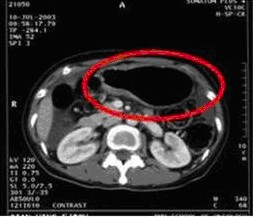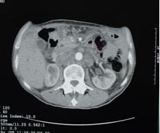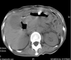治療前胃竇增厚強(qiáng)化,與周?chē)尘o,腹膜增厚,大量積水
